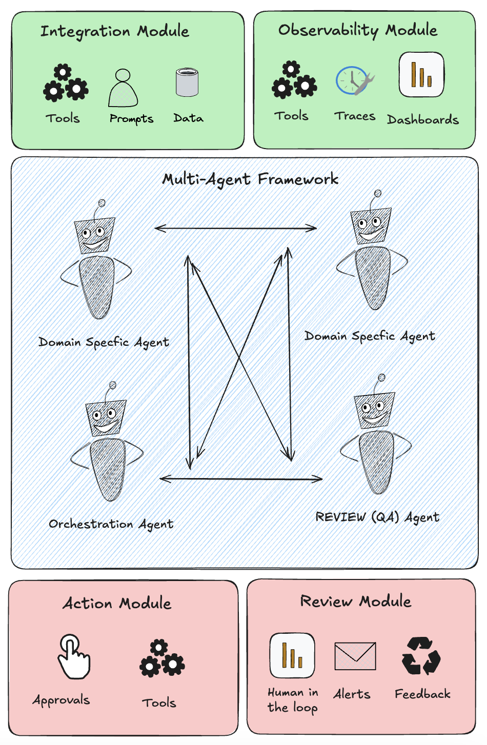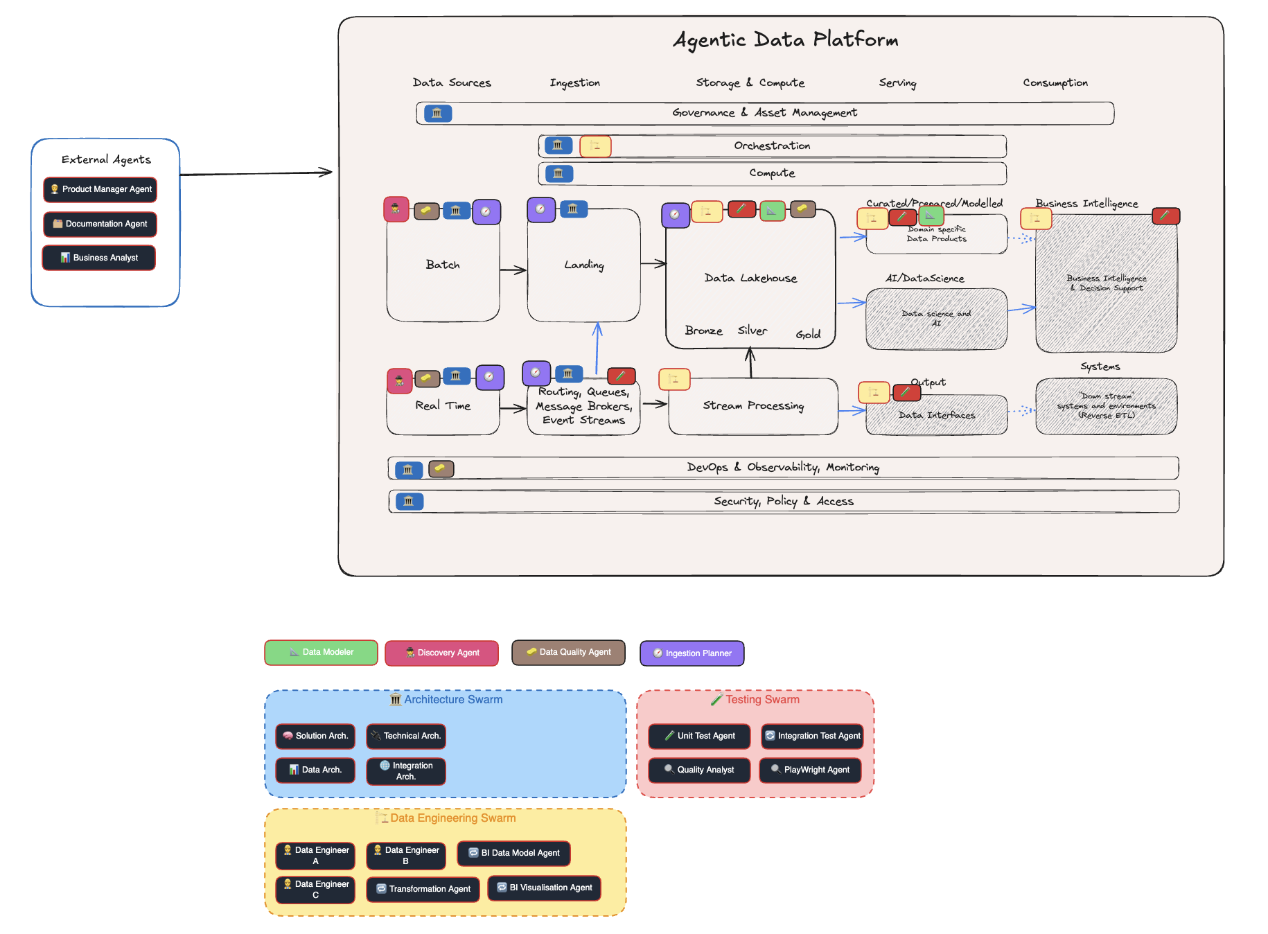 The goal here is not to overload the diagram, but to highlight agent touchpoints and responsibilities especially useful in multi-agent and swarm architectures.